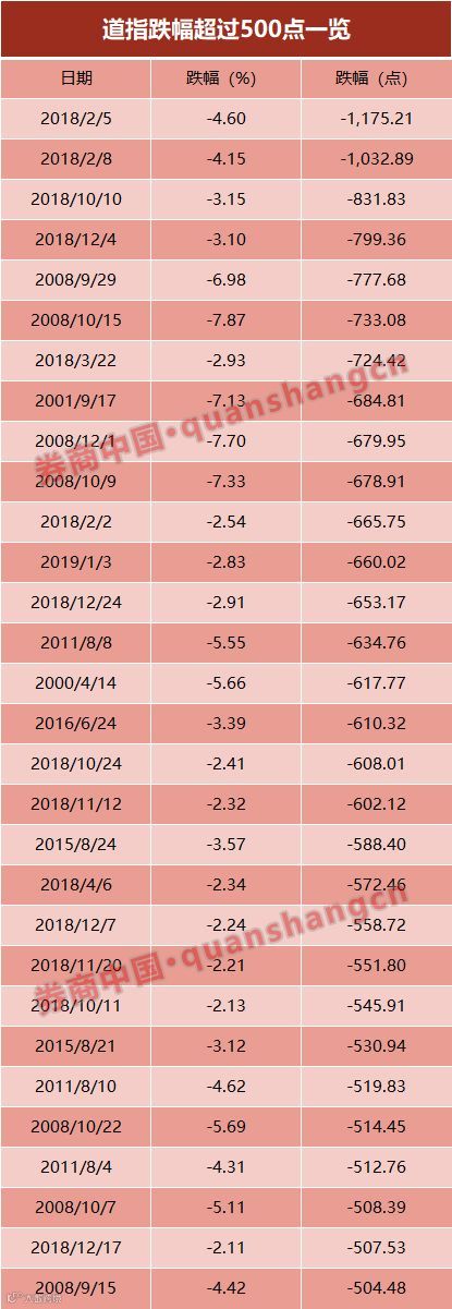 据券商中国记者统计,道指跌幅超过500点的次数共有30次,其中2018年占了14次,占比接近50%。而且,美股史上跌幅超千点的次数仅有两次,都出现在2018年。