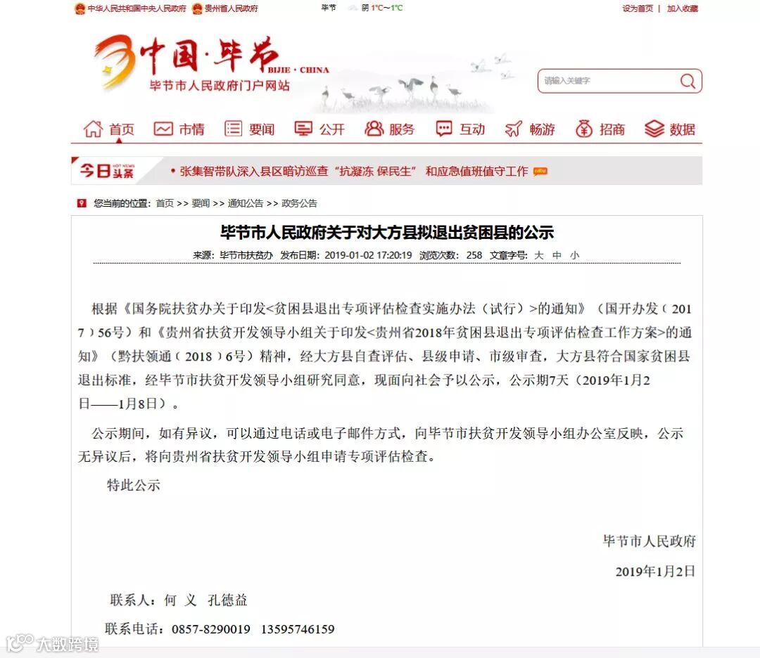 ▲2019年1月2日,毕节市人民政府关于对大方县拟退出贫困县的公示