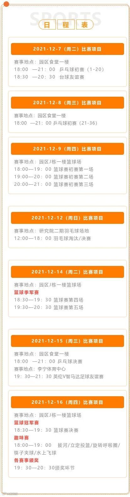 足球赛、篮球赛、乒乓球赛(男单/女单)、羽毛球赛(男单/女单)、台球赛、趣味赛