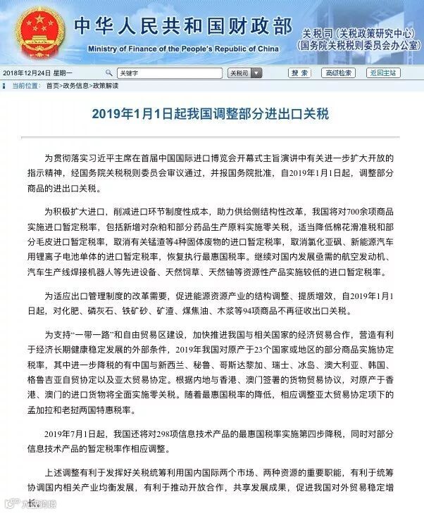 财政部最新消息显示,经国务院关税税则委员会审议通过,并报国务院批准,自2019年1月1日起,调整部分商品的进出口关税,主要包括了: