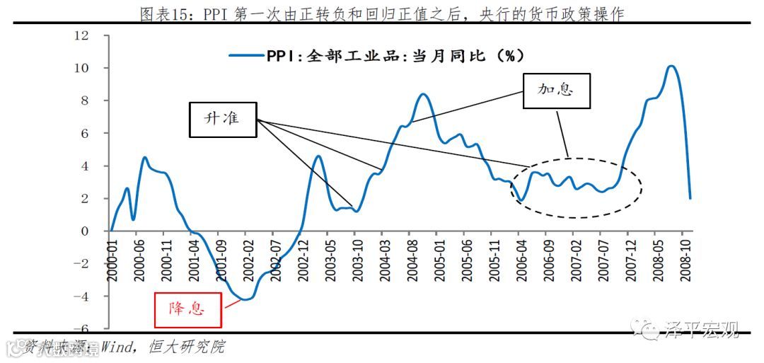 PPI第一次由正转负,央行通过公开市场操作和降息释放流动性,货币政策稳健偏松。2001年中国加入WTO,吸引大量外资,企业技术水平得以提升,成本下降引发物价水平的下滑。PPI由2000年7月的4.5%下降到2001年3月0.2%直至2002年2月的-4.2%。央行于2001年下半年在公开市场操作购买现券释放流动性,效果不明显。在PPI的低点2002年2月之际,央行启动降息,1年期存款利率下调25个BP、贷款利率下调50个BP。PPI开始回升,货币政策暂缓操作。