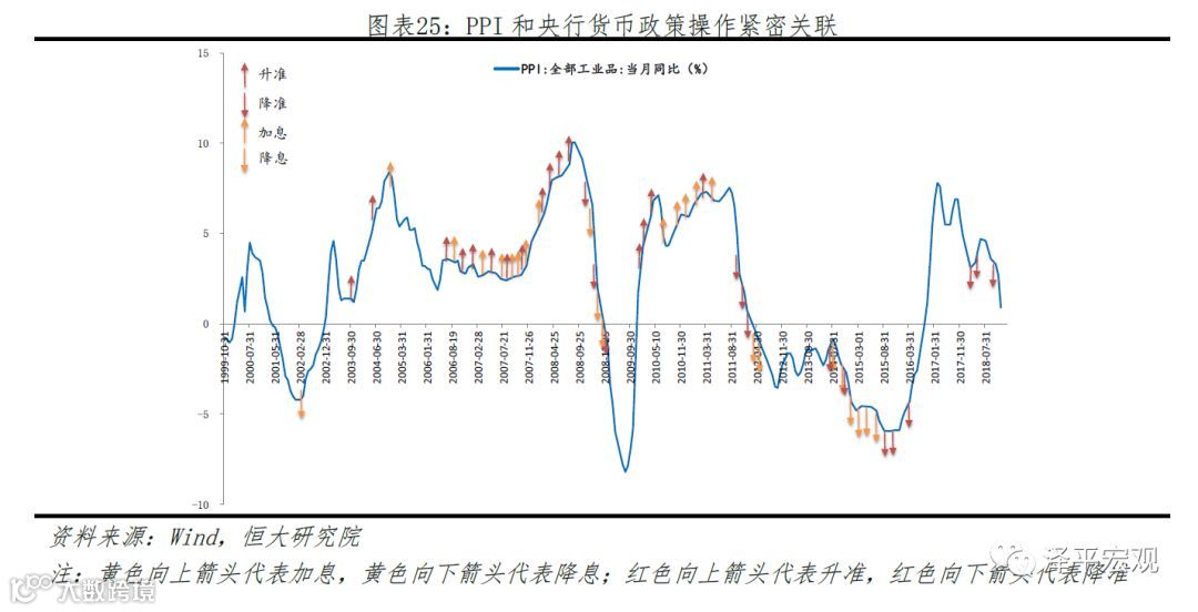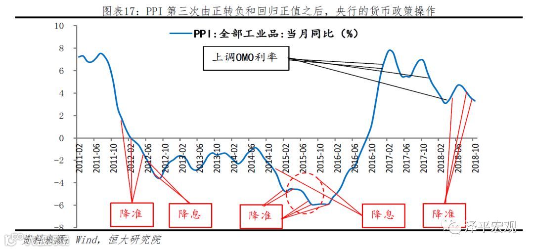 2016下半年PPI回归正值,央行金融去杠杆,严监管,叠加上调公开市场操作利率,货币政策稳健偏紧。直至2018年初PPI有回落之势,央行开始降准,货币政策回归稳健中性。供给侧改革去产能,中上游产品价格大涨,5个月时间PPI从接近0上升到2017年2月的阶段性高点7.8%。并且2017年一直处于PPI高位阶段。这一阶段,央行于2017年2月、3月、12月、2018年3月4次上调OMO利率,从 2.25%上调至2.55%。到2018年4月,PPI从高点持续下跌380个BP,央行启动降准。存款准备金率从17%下调到14.5%。