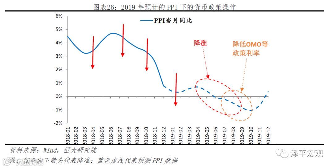 随着PPI的回落,2019年二三季度可能由正转负,意味着企业利润下滑和实际利率水平上升,货币政策降准、降息可期。回顾2018年,PPI的高位回落使货币政策表面松实际稳。一方面,PPI仍处高位,货币政策没那么着急放松,总体环境稳健偏紧;另一方面,PPI有回落趋势,货币政策边际放松进行试探,同时通过公开市场操作回笼降准释放的流动性。展望2019年,随着PPI的不断回落,我们预计上半年在下降趋势之时有望继续降准;一季度PPI刚开始回落尚未负值降息可能性不大,二三季度随着PPI由正转负,央行可能会降低OMO等政策利率。但需要注意的是,投资端表现出了较强的韧性,如果2019年看到固定资产投资超预期支撑PPI企稳,意味着降息的必要性可能会减小。
