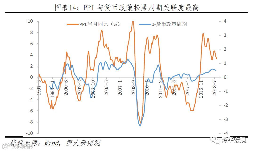 通过不同指标的对比,我们发现PPI与货币政策松紧程度变化趋势最为接近。货币政策松紧程度不仅与央行调整存款准备金率和利率,还与公开市场操作、信贷政策、监管政策相关(详见《货币还会放松吗?——货币政策周期视角》)。见下图,蓝色的线数值越大说明货币政策越紧。从2000年到现在,PPI的3次由正转负,也导致了货币政策3次大的放松;当PPI由负转正时,货币政策相应有所收紧;PPI为正数的时候,货币政策大多数也是处于收紧的状态。