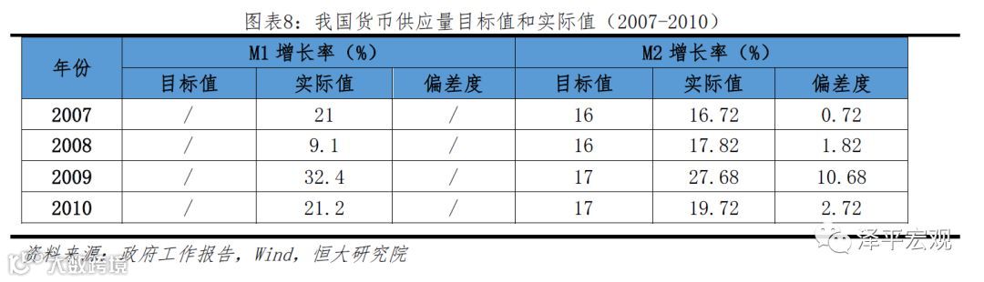 另外,2007年开始不再对外公布M1目标增速、以及M2目标值与实际值的背离,使得这一特殊时期,货币供应量目标退出货币政策锚。2009年央行公布的M2增速目标制是17%,但是实际增长28%,偏差较大。货币政策供应量不再是当时货币政策主要盯住的因素了。