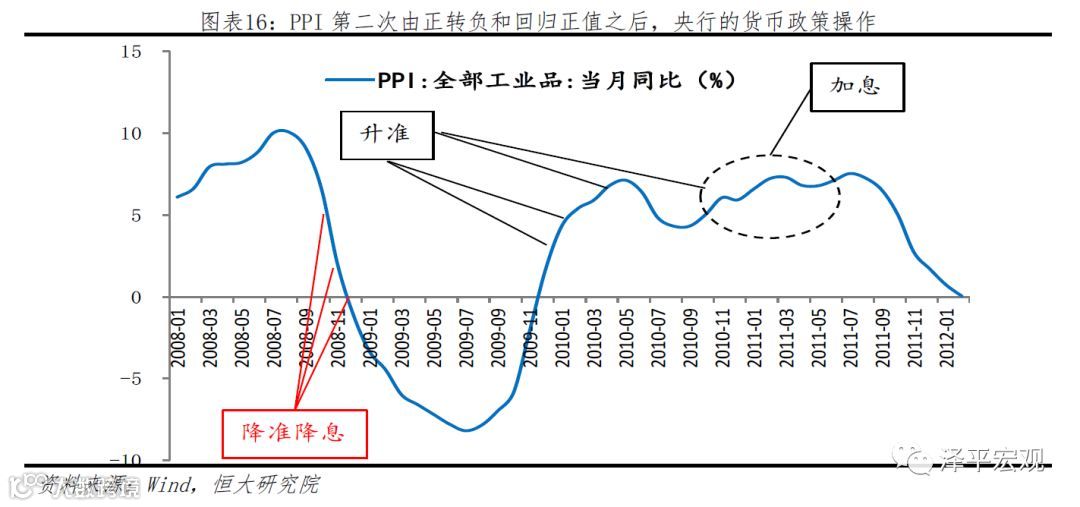 PPI第三次由正转负,央行通过降准降息和公开市场投放MLF、SLO、SLF释放流动性,货币政策稳健偏松。2012年欧债危机、中国经济进行新常态、811汇改资金外流,经济下行,PPI下滑。相比前两次,此次PPI负值持续时间较久,长达4年5个月,直至2016年8月-0.8%。PPI由2011年7月的7.54%下滑到2015年9月的-5.95%。央行也于2011年7月不再升准加息。在PPI接近0之际,2011年12月央行启动降准。在这接近5年的时间,央行7次降准至2016年3月的17%、8次降息至1.5%。同时,在2014年央行推出创新型货币政策工具为市场提供流动性。值得注意的是,2012年下半年至2014年上半年,PPI有回暖之际,央行此时并未降准降息。