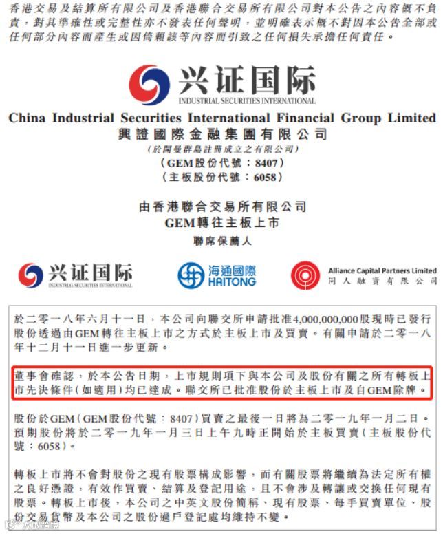 兴证国际最新公告称,香港联交所已批淮公司股份在主板上市,将于2019年1月2日自GEM(创业板)除牌,预期股份将于2019年1月3日起于主板买卖,主板股份代号为(06058.HK)。