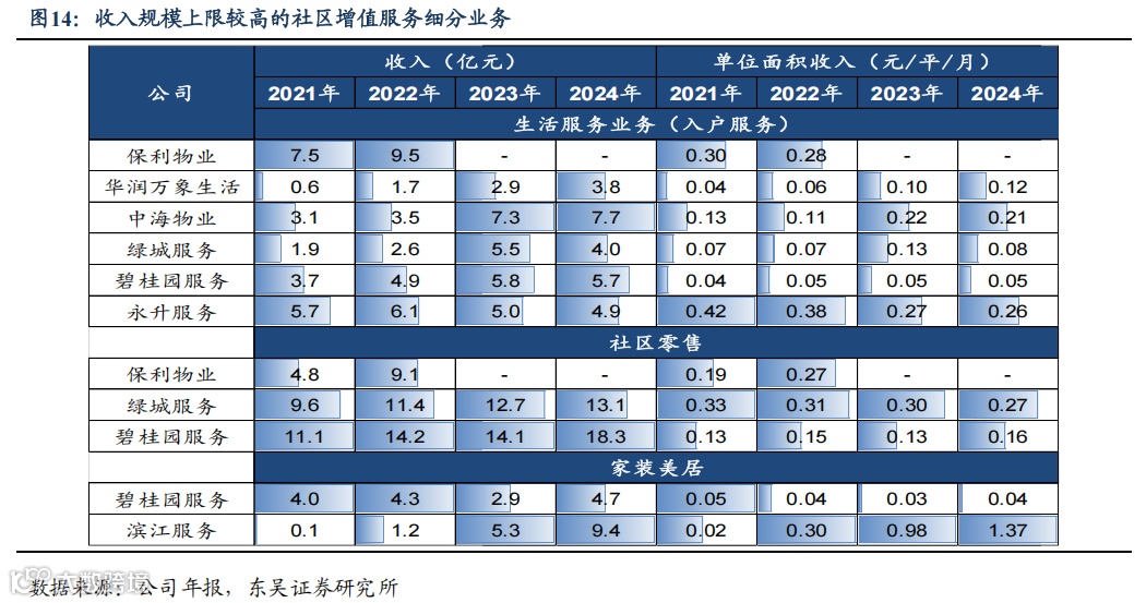 2、优先在收入体量天花板高的细分业务投入资源,尤其是单位在管面积收入水平低于行业平均的业务有机会获得稳定的增长,目前看“社区零售”、“生活服务”和“家装美居”空间较大。