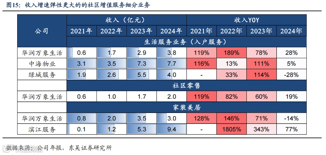 其次,需要关注收入增速弹性更大的细分业务,能够在某个阶段贡献不错的增速,从过去的情况看仍然为“生活服务”、“社区零售”和“家装美居”业务。以华润万象生活为例,公司从 2021 年起在社区增值业务上开始发力,当年在上述 3 项细分业务的收入上均实现了 100%以上的增长,并在 2022 和 2023 年也保持了较快的增速。家装美居业务这类收入和成本结算存在错配的业务虽然同样有较大的收入弹性,但需要注意主动控制节奏,否则可能会给公司收入利润带来较大的波动,例如越秀服务和建发物业都由于此项业务给公司整体业绩造成了一些扰动。