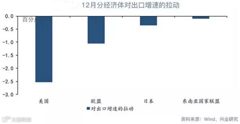 统计显示,12月份出口同比增长-4.4%,低于前值9.8个百分点。从具体国别来看,12月中国对主要发达经济体出口均现负增长,其中对美国出口同比增长-3.5%,拉低整体出口增速2.5个百分点。此外,作为内地转口贸易的重要节点——香港出口增速出现了更为明显的回落,下滑26%。