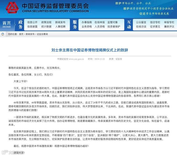 今日中国证券博物馆在上海浦江饭店揭牌开业,证监会主席刘士余出席并致辞,他表示,“今天是农历16号,公历22号,中国一向珍视‘双喜临门’的意义,今天中国证券博物馆揭牌,是个很好的日子。感谢大家28年来对中国资本市场的不离不弃。”他还称,40年改革开放,40年筚路蓝缕。资本市场从无到有、从小到大,走过了28年不平凡的成长之路,目前已建设成具有国际影响力、涵盖股票、债券和期货期权的多层次市场体系。认真汲取改革开放40年来积累的宝贵经验,以更大决心、更大勇气、更大力度推进资本市场改革开放,充分释放市场活力,切实保护投资者合法权益,让资本市场更好服务供给侧结构性改革,更好促进实体经济高质量发展。据悉,中国证券博物馆是2018年1月经中央编办批准、由中国证监会在上海设立的全国性行业博物馆,是我国证券期货行业唯一的国家级博物馆,实行理事会领导下的馆长负责制。