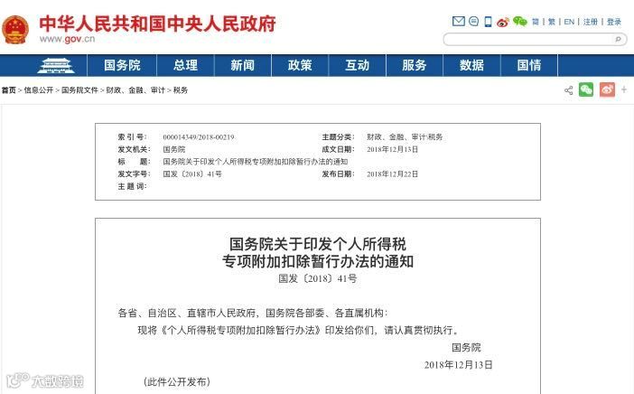 国务院日前印发《个人所得税专项附加扣除暂行办法》(以下简称《办法》),自2019年1月1日起施行。