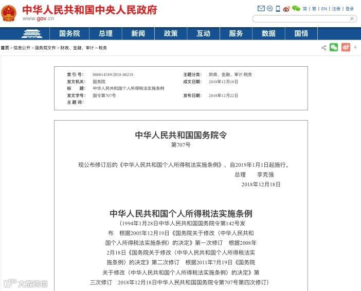 国务院总理李克强日前签署国务院令,公布修订后的《中华人民共和国个人所得税法实施条例》。