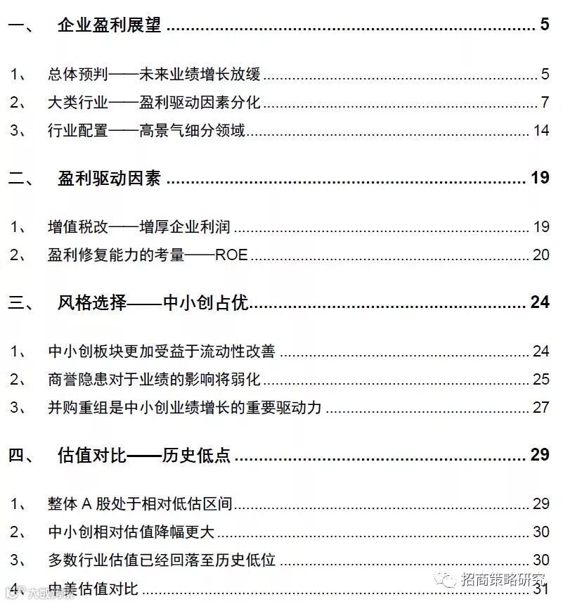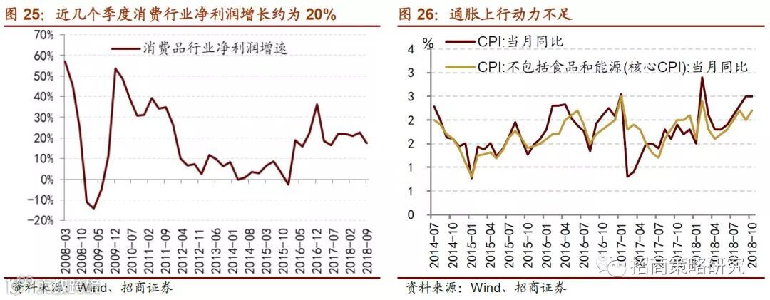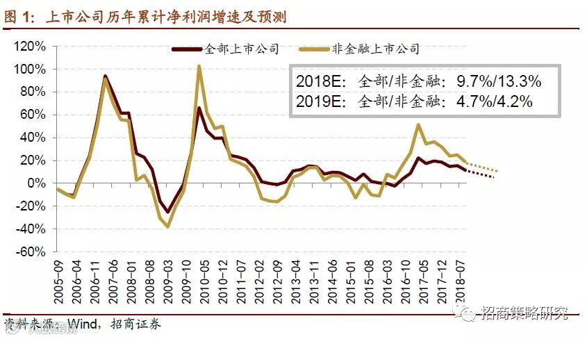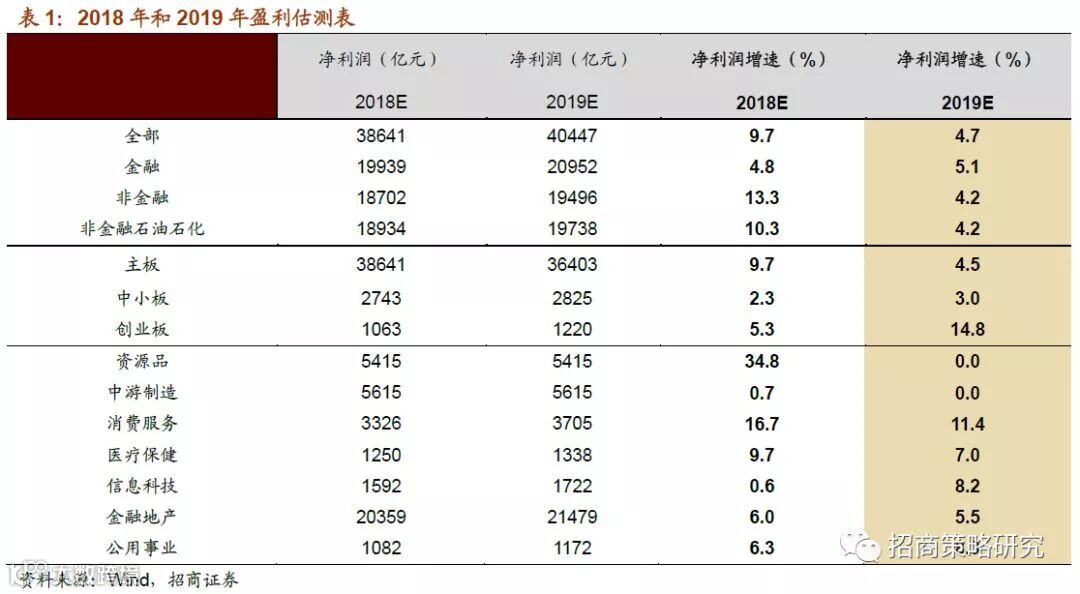 1、本轮盈利周期进入下行通道,上市公司盈利将继续探底。2019年经济增长下行压力较大,我们预计,2019年全部A股上市公司盈利增速回落至4.7%附近。金融板块盈利增速回升至5.1%附近,非金融板块整体增速回落至4.2%。随着工业品价格支撑动能减弱以及过往同期的高基数,明年资源品行业的盈利增长乏力。中游制造利润受到上游资源品和下游消费品的双重挤压,未来利润增速将进一步回落至更低的水平。消费服务行业盈利性相比其他行业较有保障,必选消费品相比可选消费品的需求更加具有刚性。预计商誉问题将在2018年年报中迎来一波出清,进入2019年以后,信息技术行业将在内生增长以及并购政策放松的带动下迎来业绩改善。