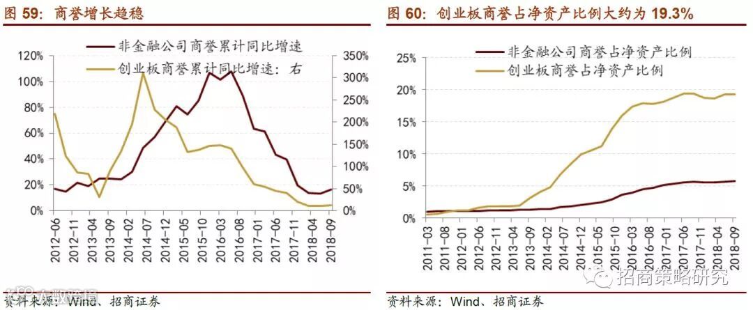 3、上一轮兼并带来的商誉问题暂时出清,并购重组有望再次成为创业板业绩的重要推动力。在国内经济增速放缓的宏观背景下,流动性宽松以及并购政策的放松有利于资金涌入中小创板块。一方面,目前监管态度的转向有利于提升市场的风险偏好,壳价值已经出现底部回暖的迹象。另一方面,有望重新崛起的兼并重组可以直接增厚母公司的EPS,提高表观业绩增长;同时2015年前后发生的大量并购重组产生的商誉问题正在逐渐出清,进入2019年商誉减值对于净利润增速的影响将基本消退。2019年开始,创业板业绩增速迎来拐点。