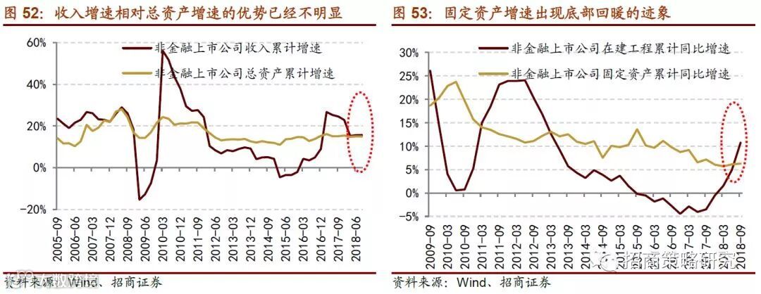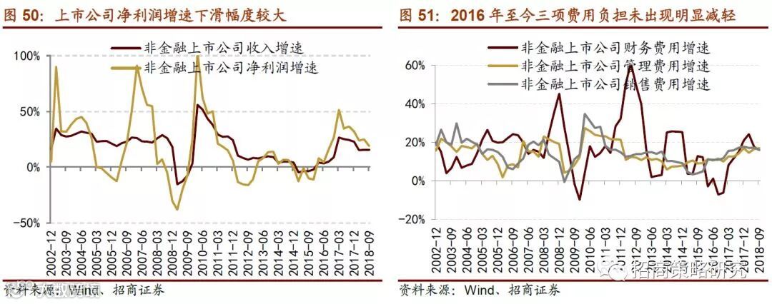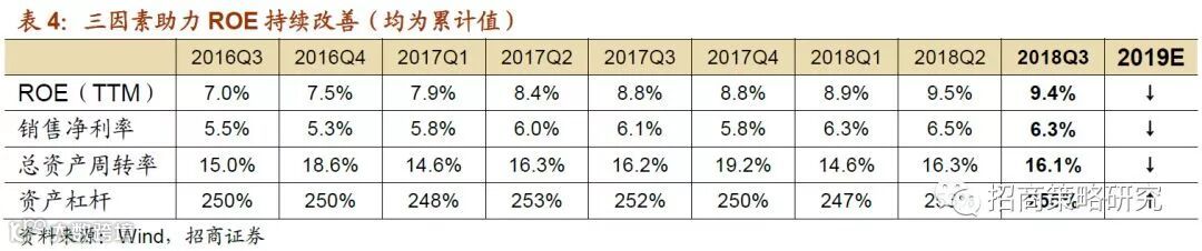 2、盈利修复能力的持续性受限,净利率和资产收益率都将拖累ROE。ROE在2018年中报达到高点,并在三季度首次出现回落,结束了过去八个季度的业绩改善,销售净利率和资产周转率是ROE触顶回落的原因。展望2019年,上市公司在前期进行的资本扩张逐渐转化在建工程和固定资产,三季度固定资产增速底部出现回暖迹象,而收入增速向上动力不足,因此总资产收益率将大概率继续回落,对ROE造成冲击。同时上游资源品带来的利润增量贡献有限,上市公司的营收增速和净利润增速大概率出现进一步回落;由于企业盈利能力改善的持续性有限,费用类科目的拖累使得业绩增速放缓的幅度大于收入放缓的幅度,因此2019年上半年上市公司销售净利率也会对ROE产生较为明显的拖累作用。