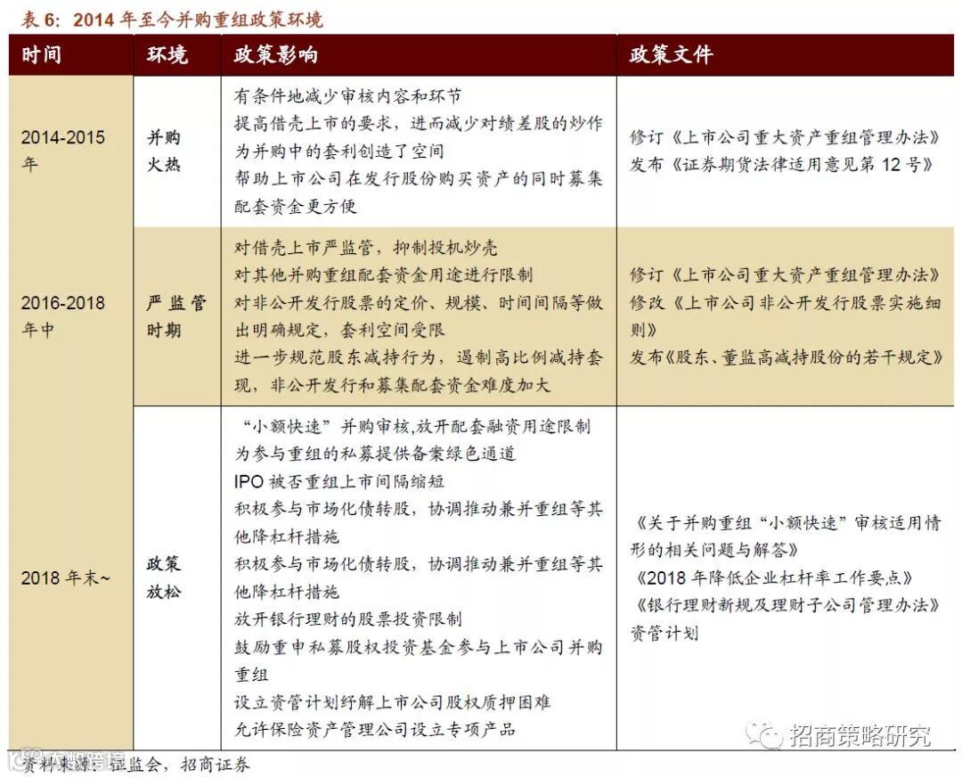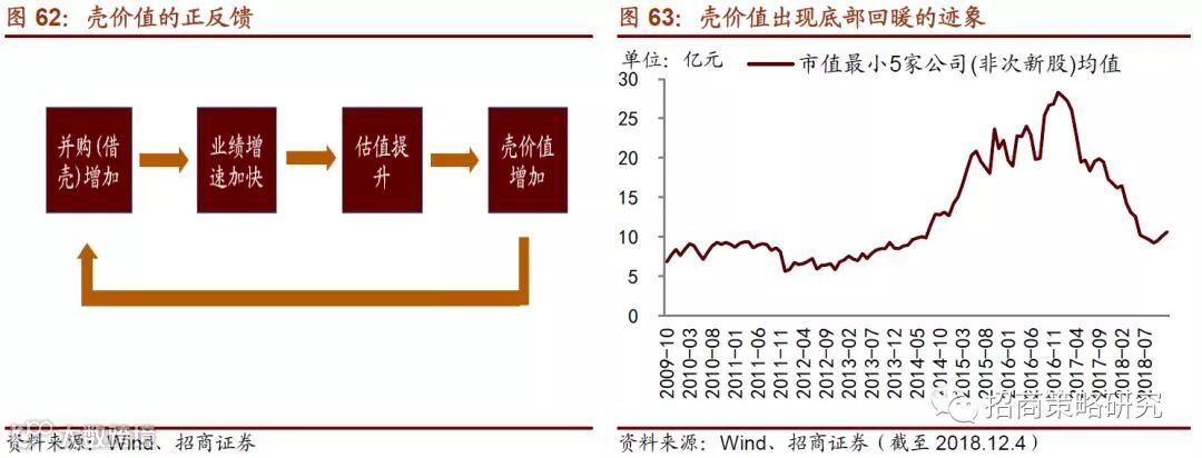 未来三年有望进入新一轮的并购上行周期。一方面,传统的公司可以通过并购来转型,另一方面,兼并收购可以直接增厚上市公司EPS并使得股东股权增值,而并购政策对于上市公司重大资产购买、重组、置换等行为的松绑以及市场流动性的宽松,都将为并购方以及被并购方降低了交易成本和风险。中小市值的估值水平提升并形成正反馈,进一步促进了兼并重组事件的增加。近期,壳价值出现底部回暖的迹象。