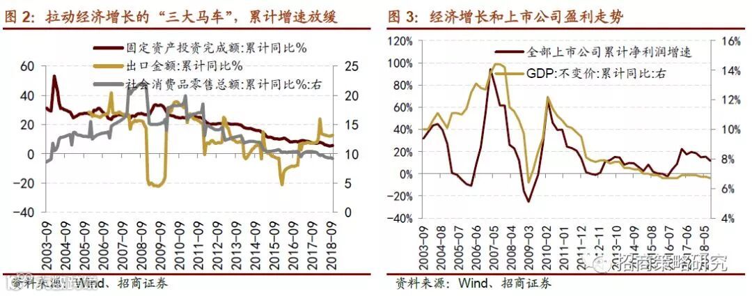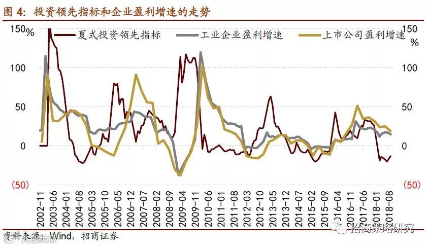整体来看,2019年中国宏观经济下行压力较大。在这样的经济背景下,再叠加上一期增速高基数,上市公司业绩增长将持续回落。无论是工业企业的盈利还是上市公司的业绩都和宏观经济密切相关。我们在《A股投资三段论》中提到,中国的经济存在三年半的信贷周期,当投资领先(社融增量增速)指标拐头向上时企业盈利随后迎来拐点,随后随着领先指标下滑,经济增速下滑,企业盈利向下。而目前的环境是经济增长持续下行,利率下行,企业盈利增速处于缓慢回落中,预计2019年上市公司业绩增长持续下行至个位数。