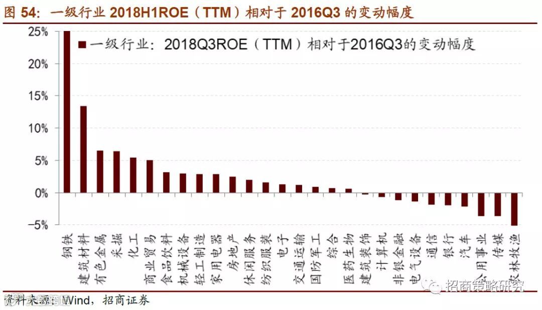 本文将不同行业在三季报中的ROE与去年同期相比发现,企业盈利能力修复最为明显的行业集中在资源品(钢铁、建材、化工、采掘)、休闲服务、机械设备、食品饮料、家用电器、商业贸易等行业。