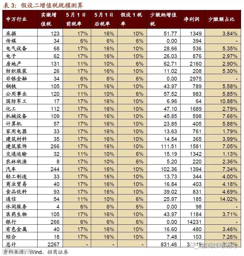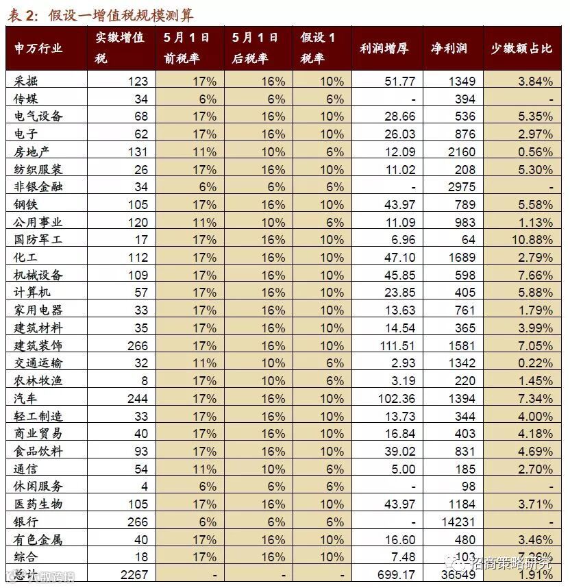 按照“三档并两档”的思路,因此假设将高税率档次下调;由于重点在降低制造业、交通运输等行业(即采掘、钢铁、军工、机械等行业,税率主要处于16%)税率,因此我们假设新的税改方案主要将16%档下调。