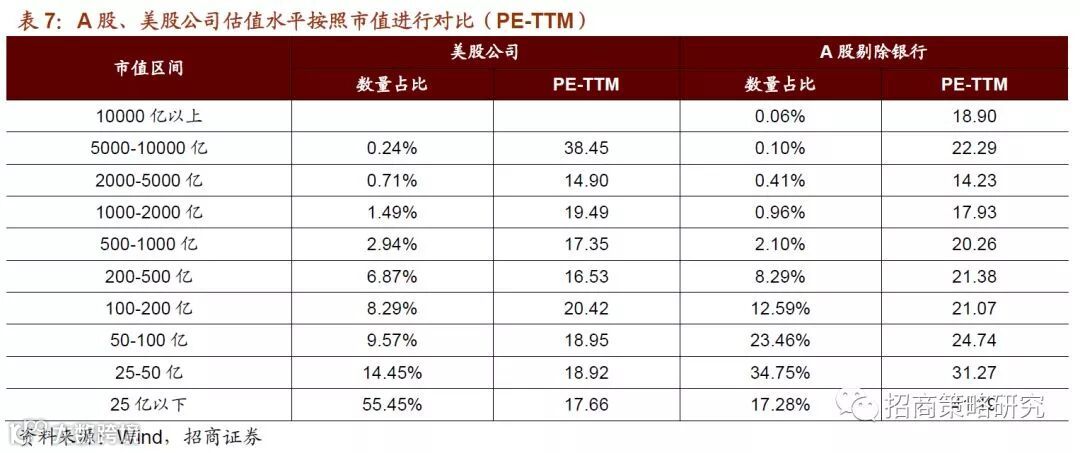 从市值区间来看,A股在5000-10000亿元之间的公司相比较美股仍有折价,这种折价主要和非银金融、地产、建筑、钢铁煤炭等行业周期性行业估值低有很大的关系。市值处于500-1000亿元之前的公司估值趋同;而25亿元以下的A股公司估值相比美股仍有较为明显的溢价,这种溢价的出现与中A股的壳价值有很大的关系。以市值最小的物价公司平均市值作为壳价值,根据测算此指标目前约为10.7亿元。