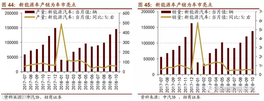 在车市整体趋冷的情况下,新能源汽车产销量维持较高的增速。根据中国汽车工业协会公布,十月新能源汽车产量为14.6万量,当月同比增速约为58.70%。新能源汽车销量为13.8万量,当月同比增速约为51.65%。国内新能源汽车生产及销售速度进入三季度以来都明显提速,随着市场在逐渐调节和抢装的正式开启,预计新能源汽车销量或保持稳中有升。在补贴政策完善和双积分制度的带动下,新能源车的销售结构有望进一步向中高端方向靠拢。