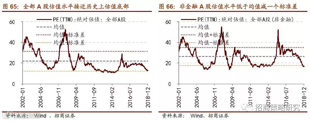 2018年以来,A股整体估值中枢不断下移,目前全部A股的估值水平已经回落至历史较低的位置(约为13.0x),接近2014年初的水平,同时也接近2002年以来的均值减去一个标准差12.2x,与历史上估值底部非常接近。非金融A股的估值水平回落至17.0x,略低于均值减去一个标准差17.7x。