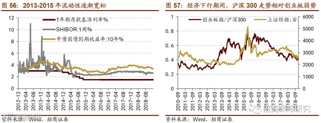 在经济增速整体回落的过程中,以中小创为首的公司更加受益于流动性改善。参考2013年至2015年,GDP增速从2013年的7.8%下滑至2015年的6.9%,增速创25年新低,产能过剩情况较为严重。在这样的经济环境下,股票市场的表现并不是由经济数据驱动,而流动性的放松以及风险偏好的提升有利于资金进入金融市场;在整体A股业绩下滑区间,沪深300走势相对创业板较为弱势。