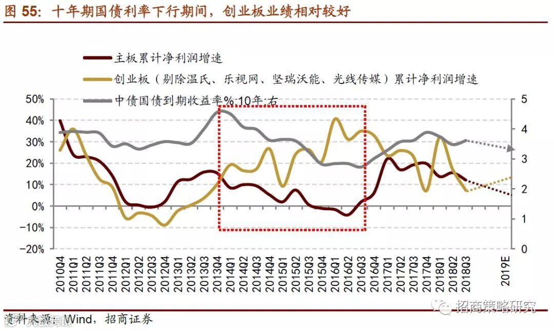 目前十年期国债利率已经回落至3.5%以下,流动性宽松而经济萎靡,2019年开始,主板增速将继续回落,商誉减值对创业板冲击减弱,并购周期有望再起,创业板业绩有望优于主板。
