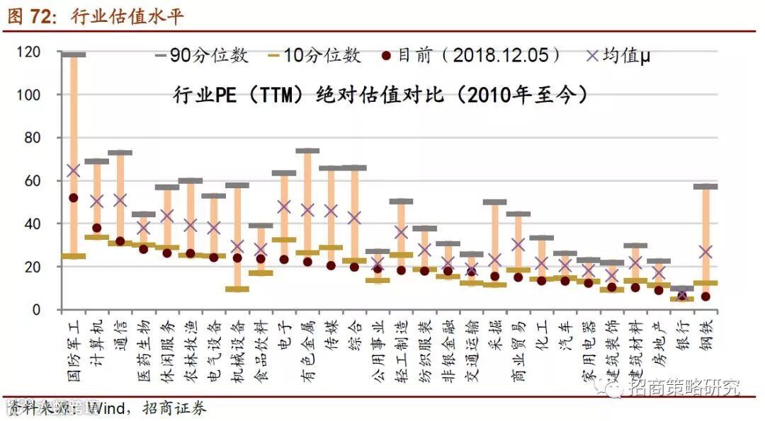 大部分行业估值水平处在历史平均水平甚至十分位数以下。国防军工,计算机、通信的估值水平高于其他行业,建筑装饰、建材、房地产、银行和钢铁的估值水平较低,其中钢铁的估值水平处于末位。