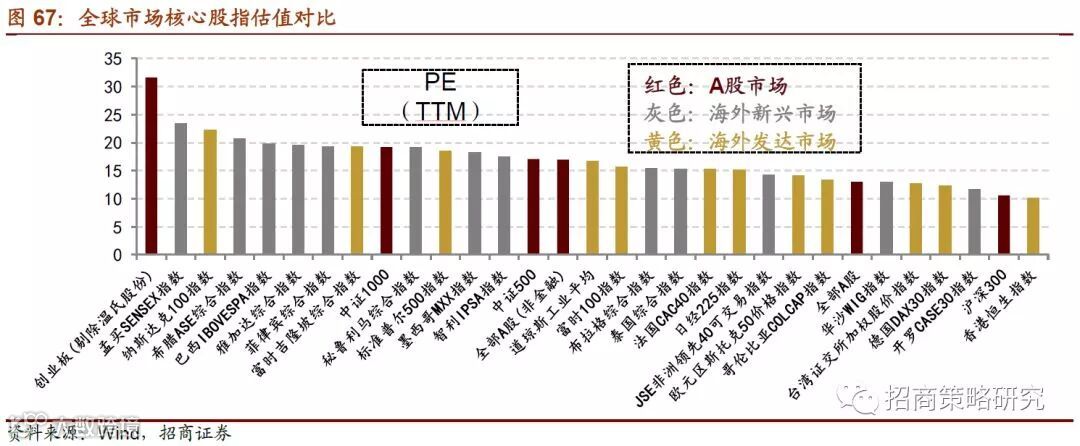 与海外市场相比,整体A股的估值水平处于较低区间,特别与美股估值相比更具优势。
