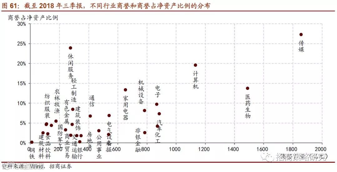 商誉分布呈现结构性特征,传媒、医药生物、计算机等行业商誉问题较为突出。传媒行业商誉占净资产的比例较高;参考2018年年报业绩预告,不少传媒公司对于可能存在的商誉问题进行风险提示。而其他行业的商誉存量和占净资产的比例处于相对低位。