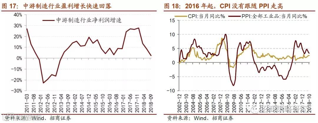 中游制造行业的净利润增速在2017年末达到本轮的高点,随后保持下滑趋势,2018年前三个季度回落至个位数增长,预计未来将进一步回落。上游资源品价格不断攀升,PPI走高对中游制造行业的生产成本带来压力,同时消费端需求并没有如期升高;2015年末PPI开始上行并且在2017年初达到顶峰,但是CPI一直处于不温不火的水平。中游制造利润受到上游资源品和下游消费品的双重挤压,目前净利润增速已经回落至较低的水平;2019年制造业投资增速将大概率回落,中游行业的业绩增长将回落至更低。