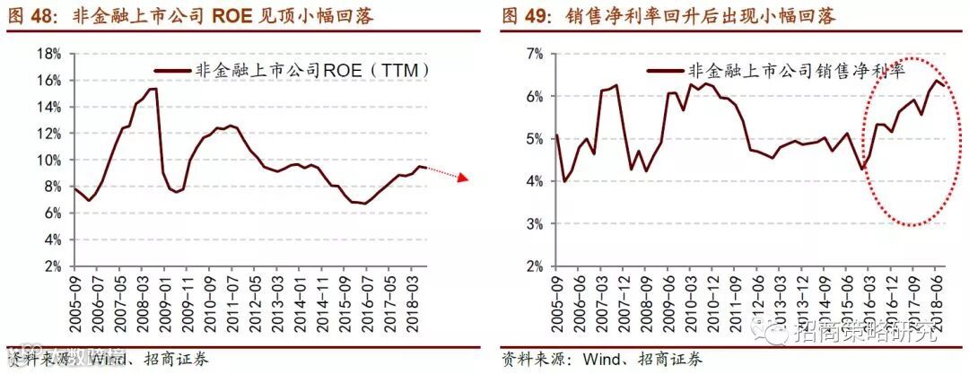 目前A股企业正处于盈利缓慢下行的阶段,在2018年三季度非金融上市公司ROE有所回落,盈利修复能力出现弱化的迹象。非金融公司ROE(TTM)由中报的9.5%回落至三季度的9.4%。销售净利率和资产周转率是ROE触顶回落的原因。展望2019年,上市公司在前期进行的资本扩张逐渐转化在建工程和固定资产,三季度固定资产增速底部出现回暖迹象,而收入增速向上动力不足,因此总资产收益率将大概率继续回落,对ROE造成冲击。同时上游资源品带来的利润增量贡献有限,上市公司的营收增速和净利润增速大概率出现进一步回落;同时由于企业盈利能力改善的持续性有限,费用类科目的拖累使得业绩增速放缓的幅度大于收入放缓的幅度,因此2019年上半年上市公司销售净利率可能会对ROE产生较为明显的拖累作用。