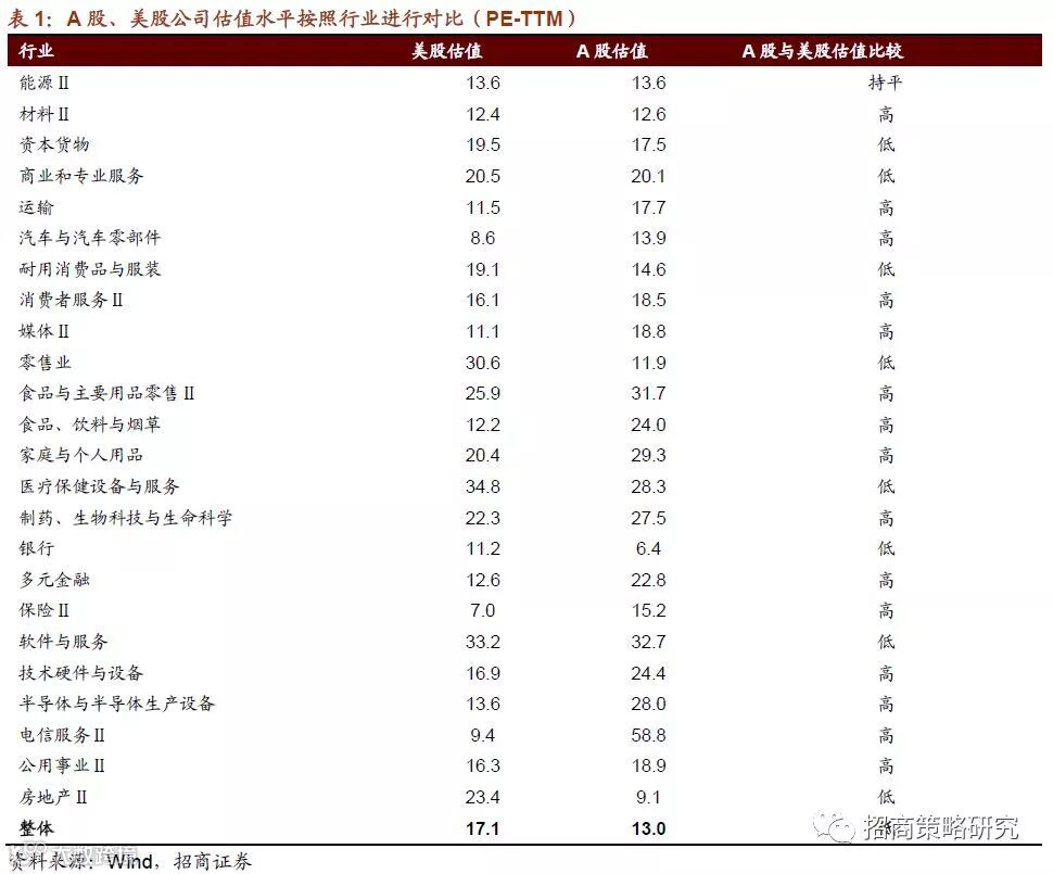 从行业来看,A股的资本货物、商业和专业服务、耐用消费品与服装、零售业、医疗保健设备与服务、银行、软件与服务、地产等行业的估值相比美股较低。