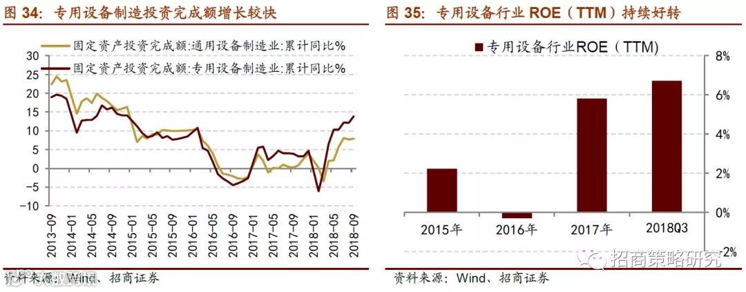 机械设备板块中工程机械销量良好为业绩带来支撑,基建反弹将加大对于工程机械的需求。机械设备行业2018年Q3收入累计增速和盈利累计增速分别为18.7%和21.0%,其中专用设备行业的盈利增长持续性较强。2018年前三个季度制造业投资增长持续好转,基建投资向下探底但是未来有望在政策扶持下迎来反弹,基建投资在经历了九个月持续下行之后已经出现回暖;专用设备制造业的固定资产投资完成额呈现快速上行的势头,前三个月累计增速大幅好转至13.9%,2017年累计增速仅为4.7%。专用设备行业上市公司Q3累计盈利增速为26.0%,其中工程机械、重型机械、印刷包装机械板块的业绩增长改善较为明显。专用设备行业盈利能力处于修复中,在经历了过去几年的去库存后行业出清效果明显,2018年前三个季度ROE持续回升至6.7%,盈利能力得到改善。同时,专用设备类如挖掘机、包装机械、重型机械等龙头公司的产品销量保持良好的增长势头。