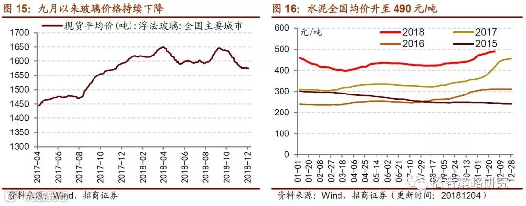 建材行业,本轮水泥和玻璃的景气度持续时间超于预期,特别是水泥价格持续上涨的趋势不减。同时水泥价格与房屋新开工面积增速的相关性较强,房地产投资放缓可能对于水泥价格的支撑力减弱,不过基建对于经济托底作用可能会对冲一部分水泥价格下滑的压力。玻璃价格已经出现回落的迹象。