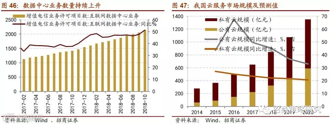 流量需求将推动云服务供应商加快资本扩张。移动互联网接入流量处于快速增长阶段,无论是个人还是企业流量需求持续高涨都对于云计算服务商的数据中心(IDC)的规模和覆盖范围提出了更高的要求。2017年国内互联网中心的市场规模为946亿元,过去四年均保持了30%以上的年同比扩张速度;同时10月增值电信业务许可项目数量为2145个,2016年至今每个月保持在35%及以上的增长速度。但是与此同时,移动互联网接入流量的增长速度扩张更快,2017年累计增速为163%,2018年前十个月累计增速为152%。流量需求热情持续高涨将促使供给端加快对于数据中心的建设。