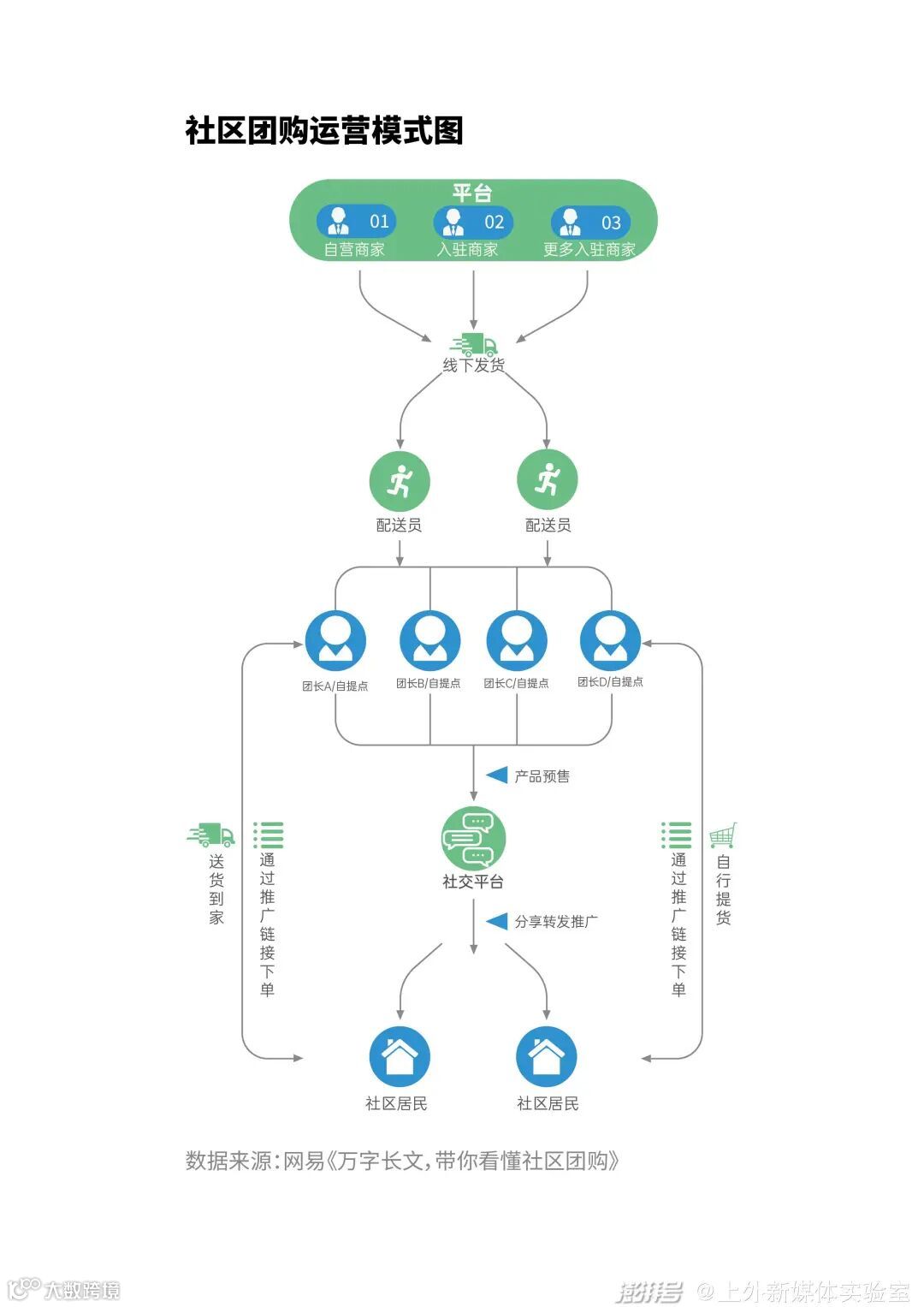 商家在购物平台上推出自己的商品,由团长将商品介绍推广给居民。居民通过加入团长组织的线上社群,参与特定商品的拼团或者直接在平台上下单。团长汇总订单,平台负责采购商品,再由团长完成送货上门服务或者提醒居民到指定地点自提商品。团长即为供应商与消费者之间的桥梁。