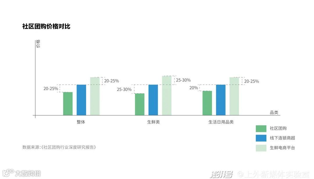 社区团购凭借较低的价格在社区便利店、社区生鲜店或菜场的竞争中脱颖而出,实现了市场下沉,并以三、四线城市顾客为目标对象。根据《社区团购行业深度研究报告》数据显示,相较线下连锁商超,社区团购整体上便宜约 20-25%,生鲜类便宜25-30%,其他生活日用品类便宜约20%,可见社区团购这些品类与商超相比都明显的价格优势。