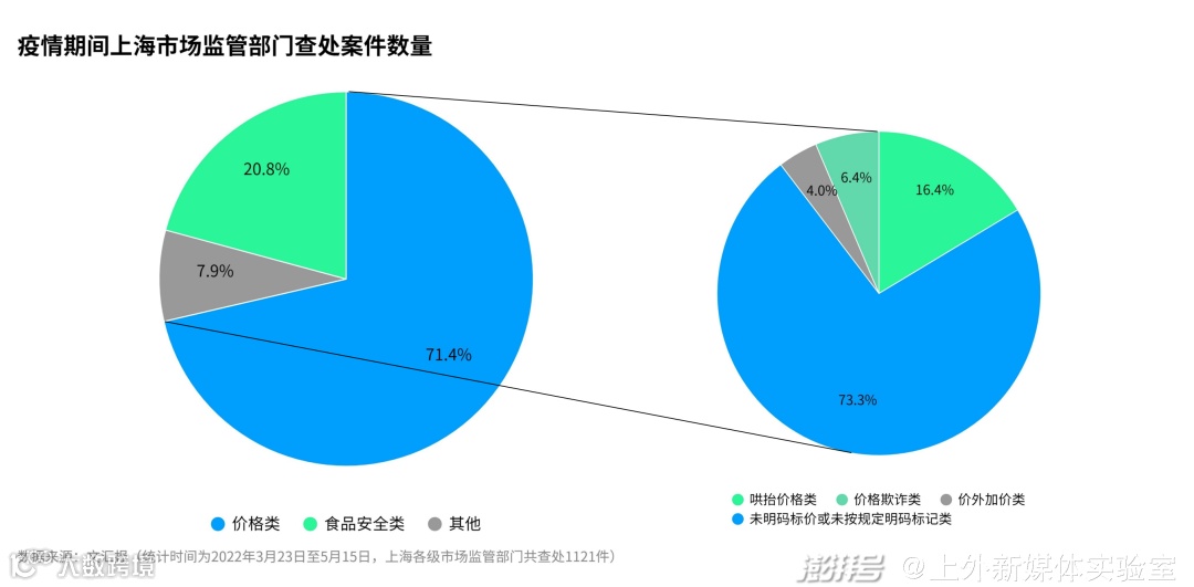 从3月23日至5月15日,上海各级市场监管部门已累计查办市场监管领域案件数1121件,其中价格类案件800件,占71.4%,食品安全类案件233件,占20.8%,两类案件数占比超过总案件数的90%。