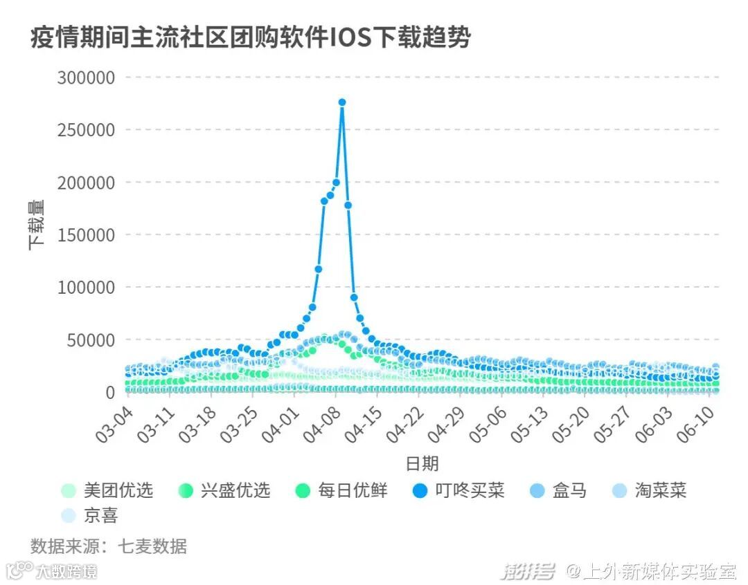 从3月底开始,各类团购APP的下载量普遍上升,叮咚买菜下载量更是一飞冲天,四月份后下载量逐渐降低,趋于稳定。