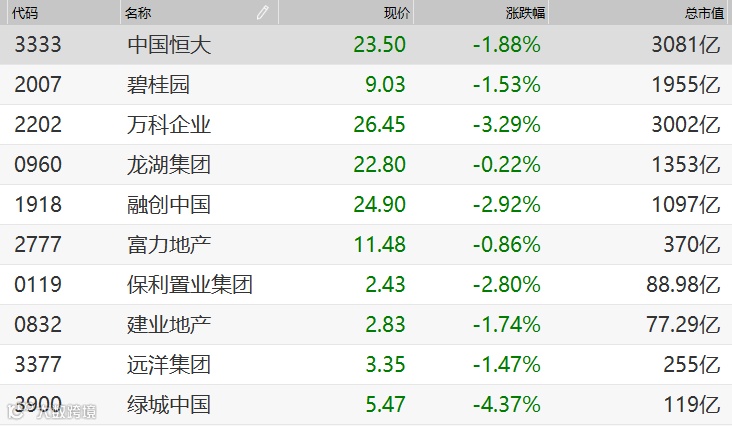 同样情况在港股市场上,恒大、碧桂园等内房股,也全线收跌,但是跌幅明显小于A股市场。