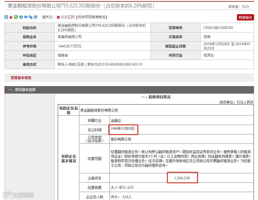 而券商中国记者查阅资料后发现,国银金融租赁的注册资本正是126.4亿元,而交银金融租赁注册资本才85亿元,且国银金融租赁设立日期亦是1984年12月25日。信息与挂牌转让的匿名标的物几乎丝毫不差。