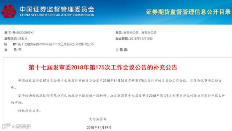 证监会网站11月19日披露,鉴于陕西西凤酒股份有限公司(简称“西凤酒”)已向证监会申请撤回申报材料,决定取消第十七届发审委2018年第175次发审委会议对该公司发行申报文件的审核。