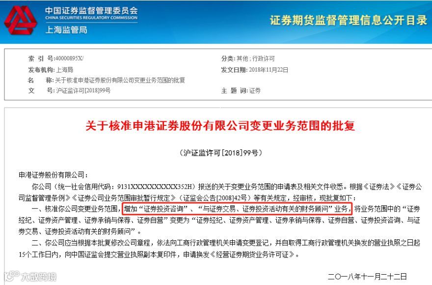 券商中国记者注意到,近日,上海证监局公告了《关于核准申港证券股份有限公司变更业务范围的批复》,在申港证券原有“证券经纪、证券资产管理、证券承销与保荐、证券自营”四大牌照的基础上增加“证券投资咨询”、“与证券交易、证券投资活动有关的财务顾问”两大业务牌照。