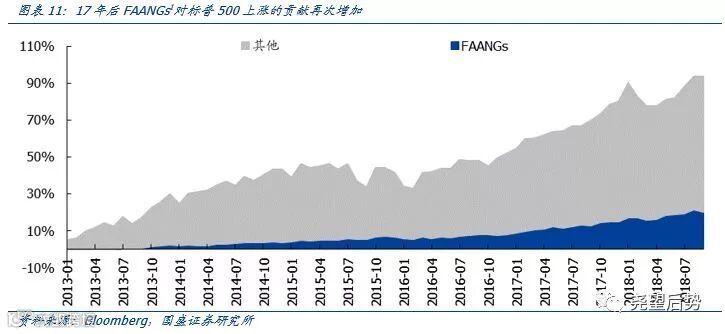 2)由普涨变为依靠少数企业拉动,比较典型的就是FAANGs企业对于标普500指数上涨的贡献在2017年后再次出现较大幅度的上升;