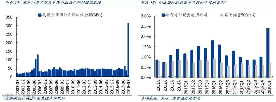 股票回购对EPS提升贡献较大。2017年12月,美国国会通过了“减税与就业法案”(Tax Cuts and Jobs Act),下调企业海外盈收转入美国时的税率,带来海外利润回流,推动美股回购升温。
