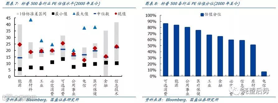 结论二:无论横向或纵向比较,美股已经不便宜。纵向来看美股估值已从底部抬升较多,横向来看美股估值较主要市场为高,从行业看美股各行业估值水平也不算低。