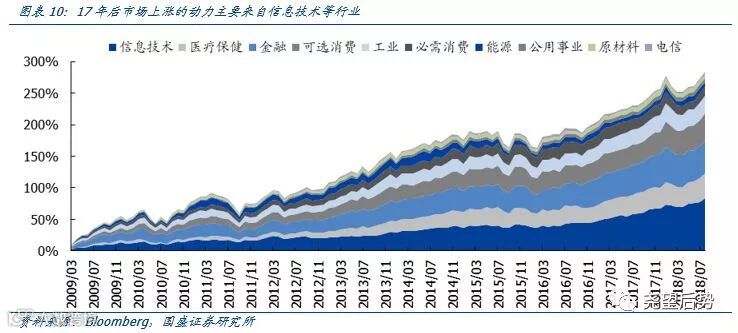 1)由全行业推动转为个别行业推动。从各行业对于市场上涨的贡献来看,2017年后市场上涨的动力主要来自信息技术、医疗保健和可选消费行业,合计贡献了8成以上的涨幅;